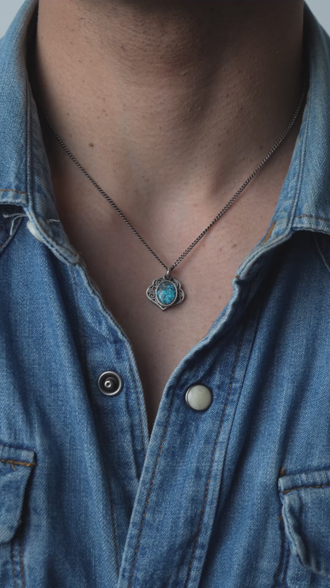 Celebrate craftsmanship and natural beauty with this exquisite Blackened Silver Arabesque Pattern Necklace featuring Kingman Turquoise — a piece that embodies artistry, style, and timeless appeal. It’s an ideal gift or a treasured addition to your jewellery box, sure to become a favourite for years to come.
