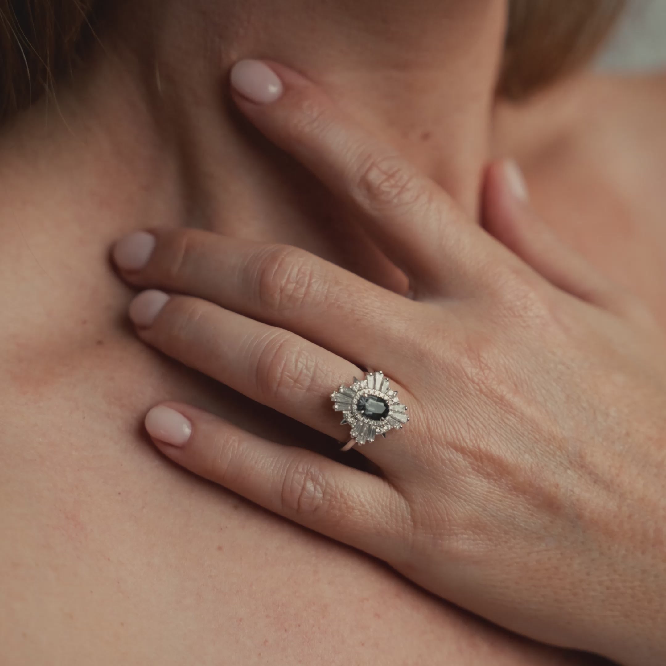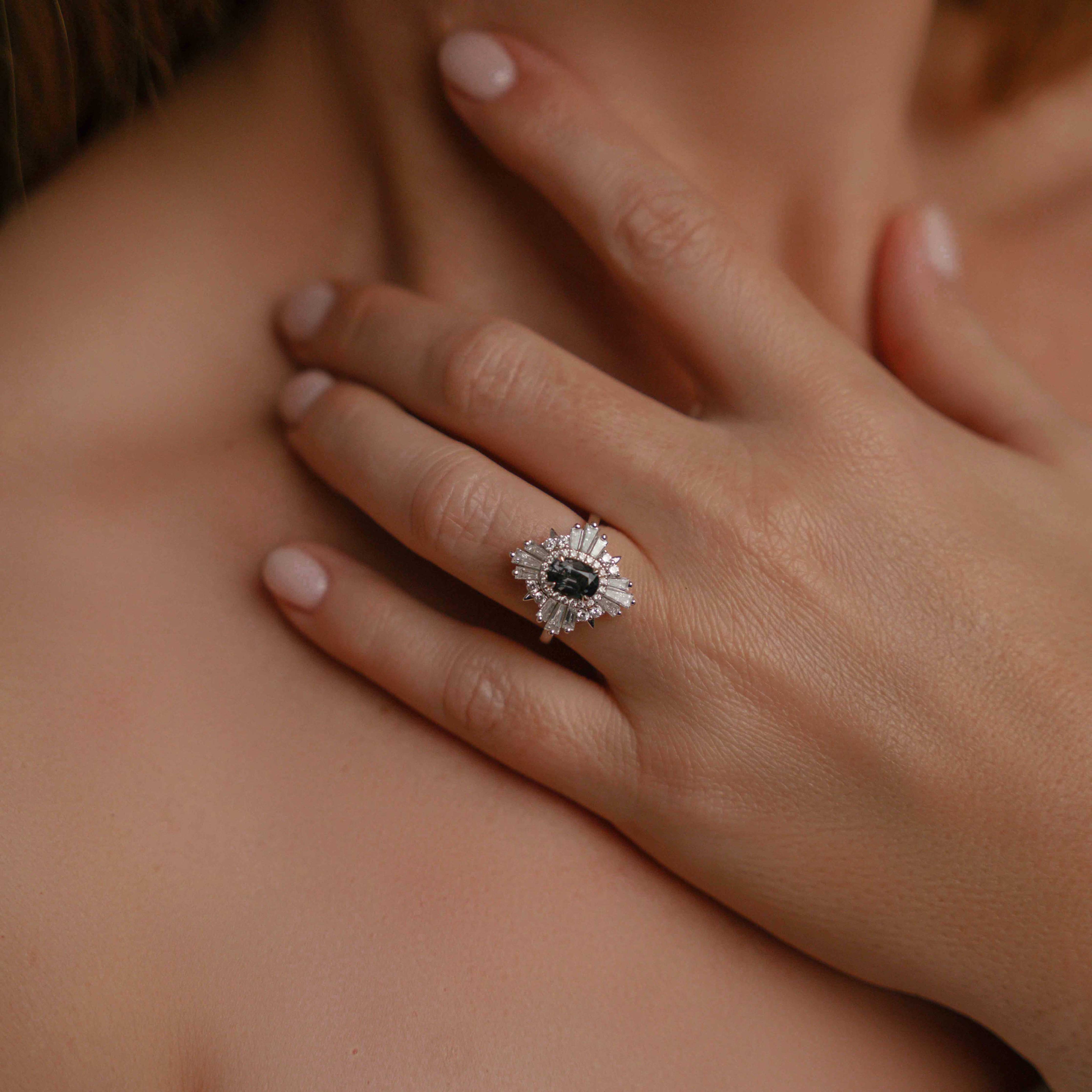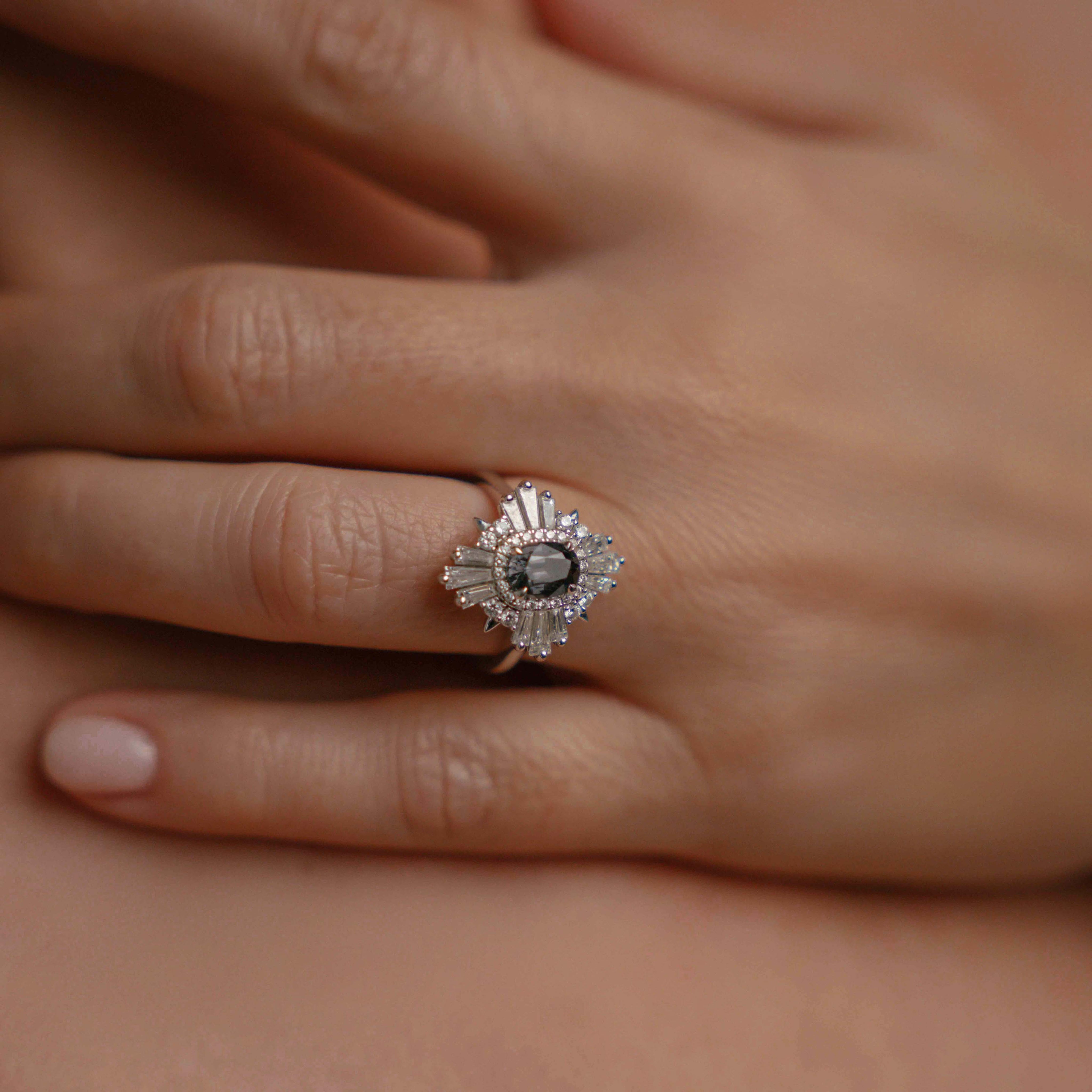 Introducing our exquisite 18ct White Gold Claw Set Oval Spinel and Art Deco Style Diamond Alternative Engagement Ring, a one-of-a-kind piece weighing approximately 5.00 grams. This stunning ring features a captivating 1.00ct oval-shaped blue/gray spinel at its center, flanked by an impressive array of diamonds.