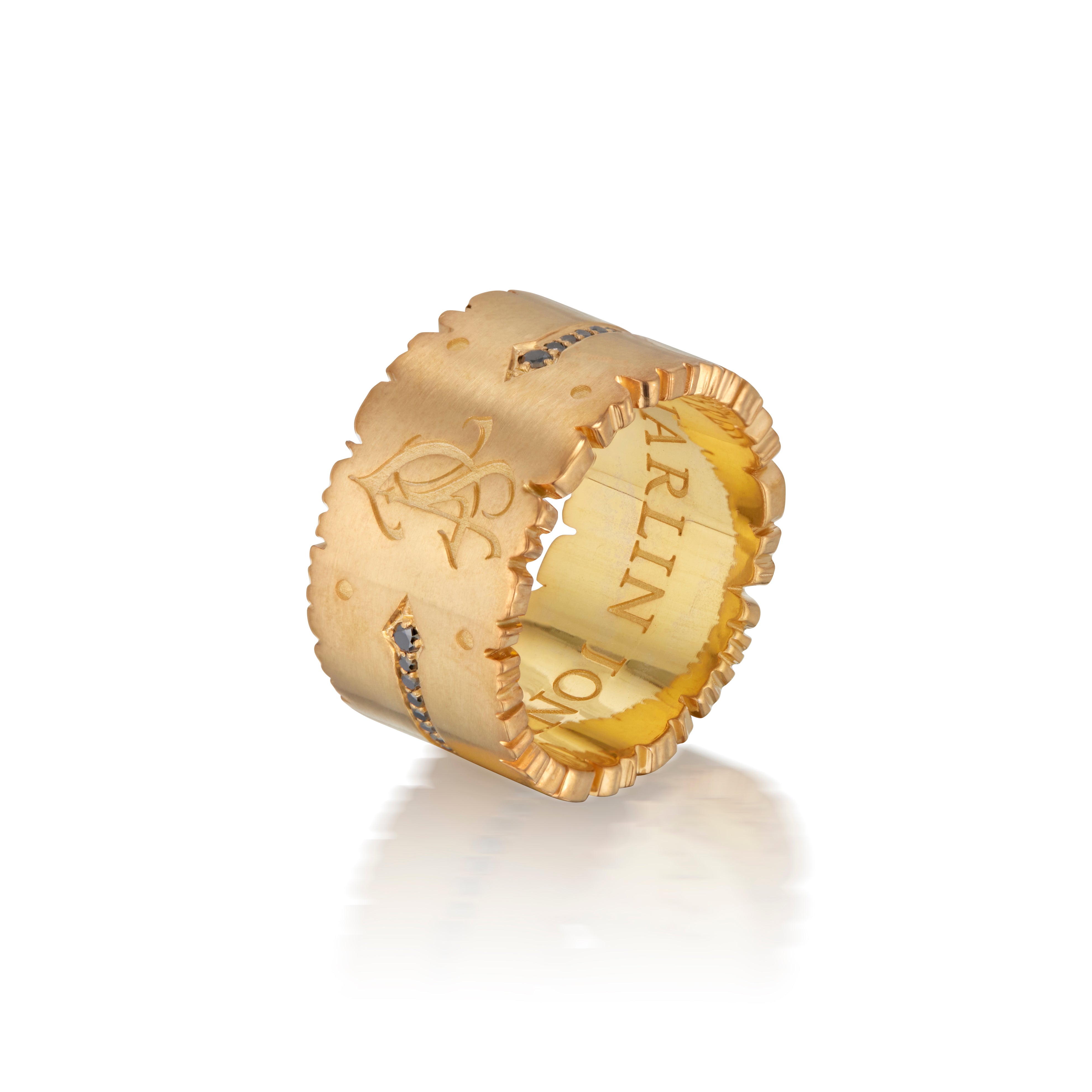 The 'Jagged Edge' yellow gold men's wedding band is perfect for those who like a personalized touch. Micro-pave black diamonds are set in a double arrow channel through the middle of the 13mm wide band to give this men's wedding band a look of luxury.