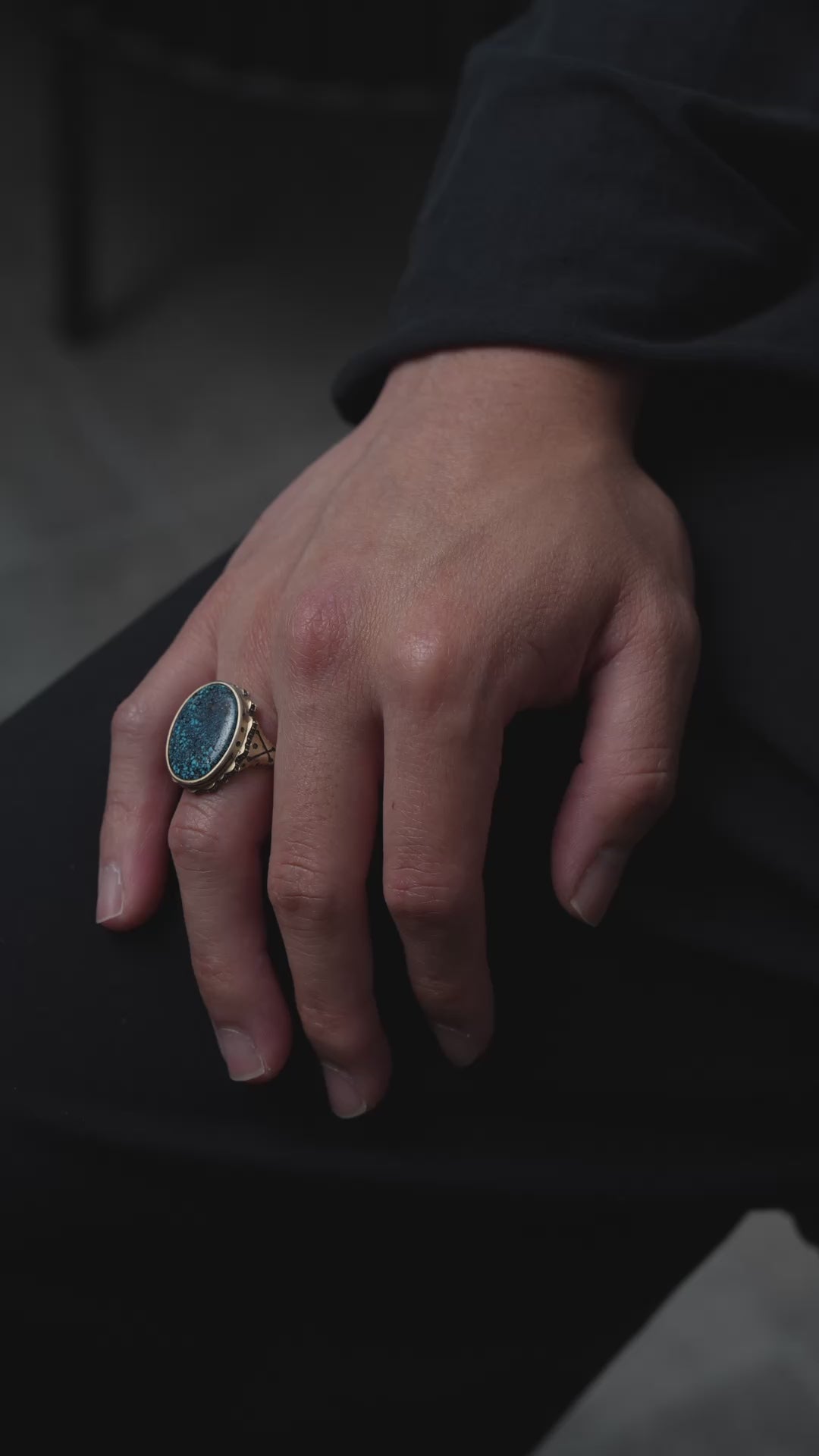 Sitting center stage is a Killa deep blue, black-webbed Kingman turquoise which works beautifully with the matt finish yellow gold setting and truly gives this men's wedding band its rock n roll status.